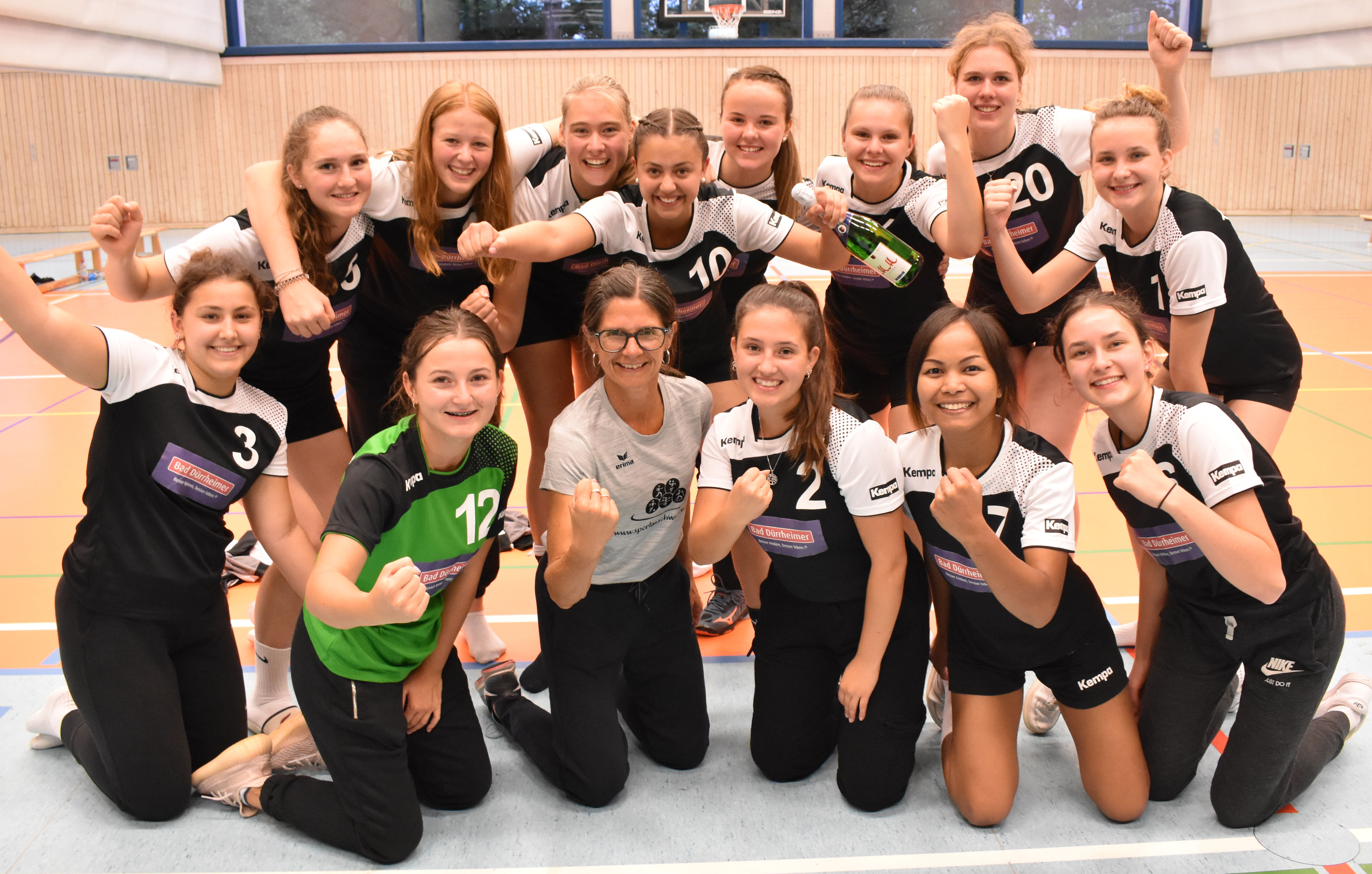 Kniend von li nach re: Mia Leber, Paula Romer, Trainerin Andrea Greguric, Carolina Kern, Rungkarn Röser und Alina Bayer