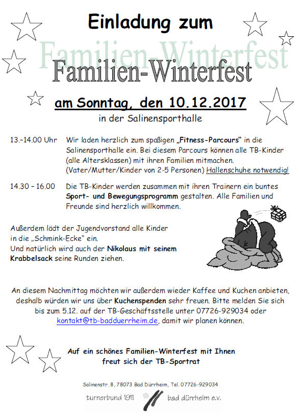 am Sonntag, den 10.12.2017 findet unser traditionelles Familien-Winterfest statt.